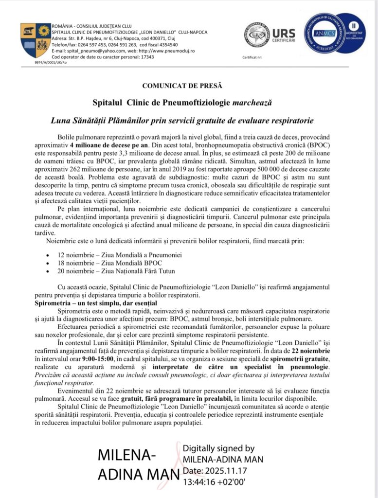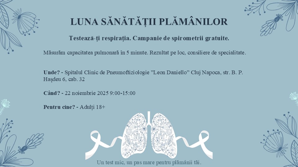 LUNA SĂNĂTĂTII PLĂMÂNILOR Post author:admin 2 Post published:November 17, 2025 Post category:Evenimente / Interne / Știri Screenshot You Might Also Like WORKSHOP-UL NAȚIONAL „RESPIRAȚIA ȘI VENTILAȚIA NONINVAZIVĂ” CU PARTICIPARE INTERNAȚIONALĂ February 3, 2020 Rezultatele mecanismului de feedback – August 2025 September 10, 2025 Rezultatele mecanismului de Feedback – 2020 January 15, 2021
